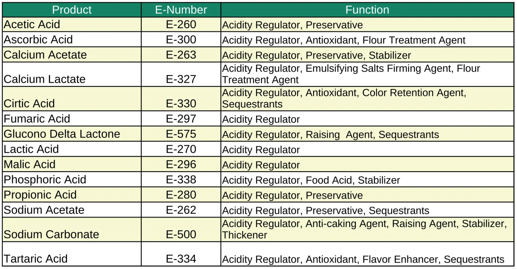 Acidity regulators increase the acidity of a foodstuff or are used to improve the organoleptic quality of a product by imparting it with an acid flavour. They are often organic acids such as ascorbic, citric, or acetic acids. Acidity regulators also include phosphates and phosphoric acid.
